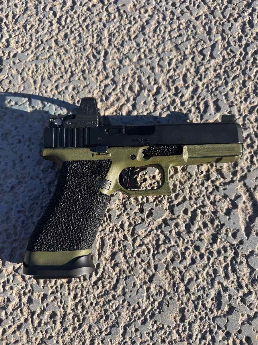 G17 Gen 5 with tons of upgrades. Custom slide cuts with suppressor sights forward of the Leupold DPP, awesome stippling job with OD green cerakote. Apex trigger as well. $1000 cash, no trades. Text 806-544-9260